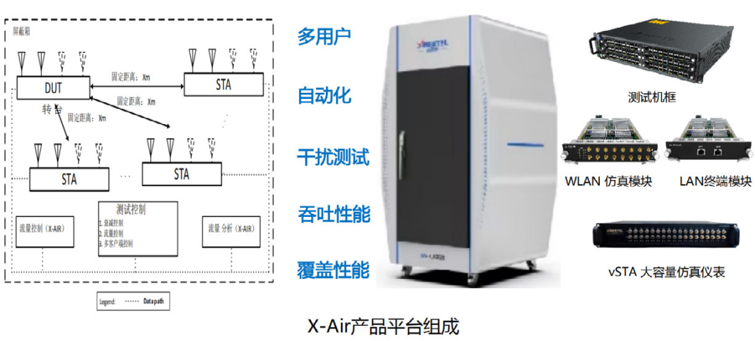 信而泰针对WiFi7高吞吐、低时延、大并发、抗干扰、高可靠等技术特性自主研发了X-Air系列产品,其是面向访问接入点(AP)、家庭网关及 WLAN 系统的专业测试设备,凭借真实多终端模拟与真实4-7 层应用模拟,可以精准衡量WLAN设备的基本性能、功能完整性与长期稳定性。