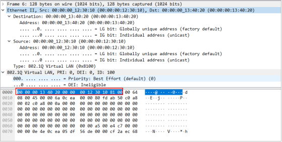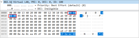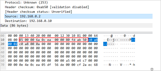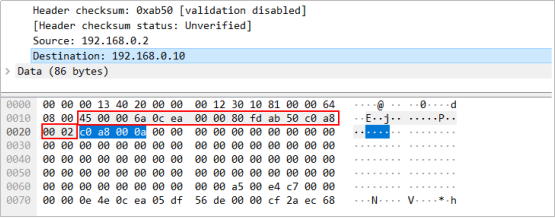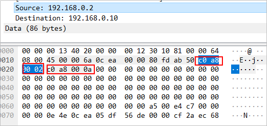 例如报文中,源 IP 地址为 192.168.0.2 (0xCAA80002),目的 IP 为 192.168.0.10