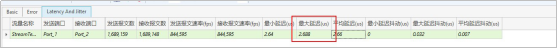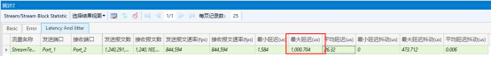 查看测试仪上时延统计,可以看到最大时延为 1ms