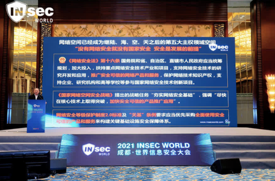 第三届INSEC WORLD 成都·世界信息安全大会召开。中央网信办专家咨询委员会顾问、中国工程院院士沈昌祥带来了《打造网络空间安全 可信主动免疫新生态》的主题演讲。