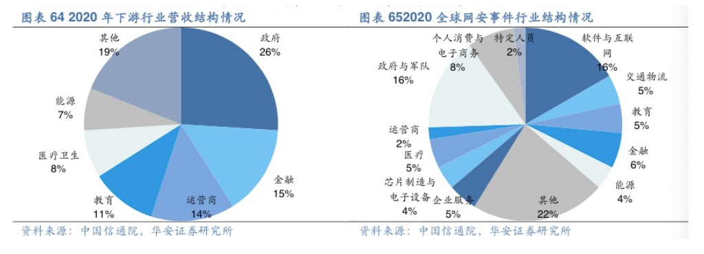 华安证券分析师尹沿技认为,“各行业的网安事件的占比某种程度上代表了各行业的网络安全需求占比,而未来我国全行业的数字化有望在除金融、运营外的其他行业催生新的安全需求,扩大市场规模,下游格局有望改变。”