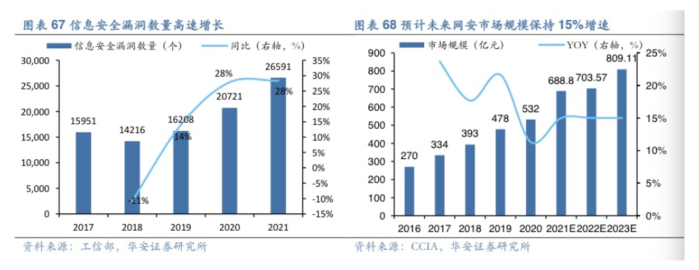 根据CCIA数据,2023年网络安全市场规模预计达到809.11亿元,同比增速15%。华安证券预计,网安未来3-5年将保持高景气,将迎来新一波投资机遇。