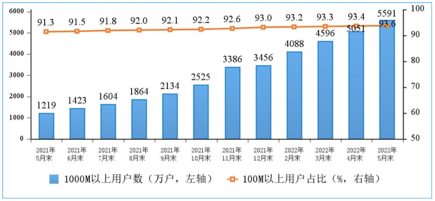 根据2021年工信部发布的《“双千兆”网络协同发展行动计划》(2021年-2023年),到2023年底,千兆光纤网络具备覆盖4亿户家庭的能力,10G PON及以上端口规模超过1000万个,千兆宽带用户突破3000万户。截止今年5月,上述目标均已完成,千兆宽带用户发展速度更是远超计划。