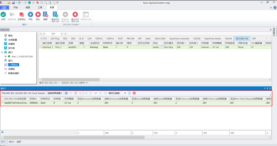启动GPTP协议在网络测试仪上查看时钟同步报文交互结果。