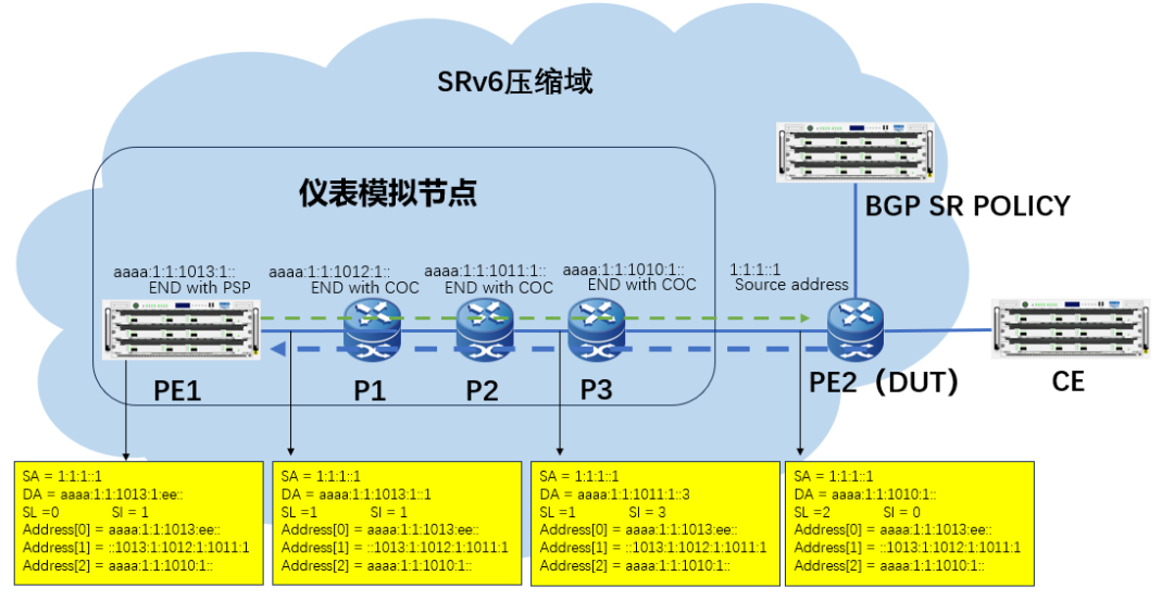 仪表模拟PE+P, 设备对仪表流量执行引流,此方式可真实模拟设备对于G-SRv6模型的测试,构建时可参考如下方式: