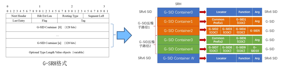 为了区分G-SID和SRv6 SID而定义了COC(Continuation of Compression)Flavor。COC Flavor是SID的一个特殊属性,用于识别下一个SID是否为32bit的G-SID。COC Flavor可用来标记Segment List中G-SRv6压缩子路径的起始和结束,即128bits SID和32bits的G-SID之间的边界。