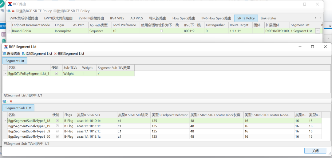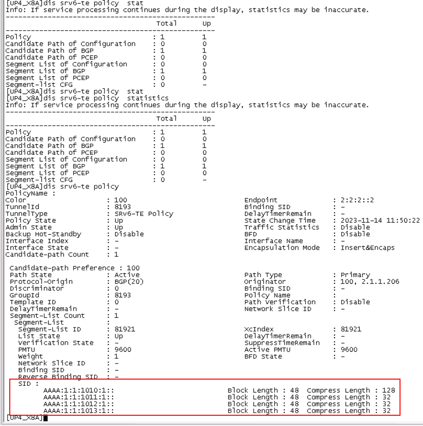 dut上查看srv6 policy状态正常,segment-list上显示第一跳SID位128位不压缩,从第二跳开始压缩成32位;