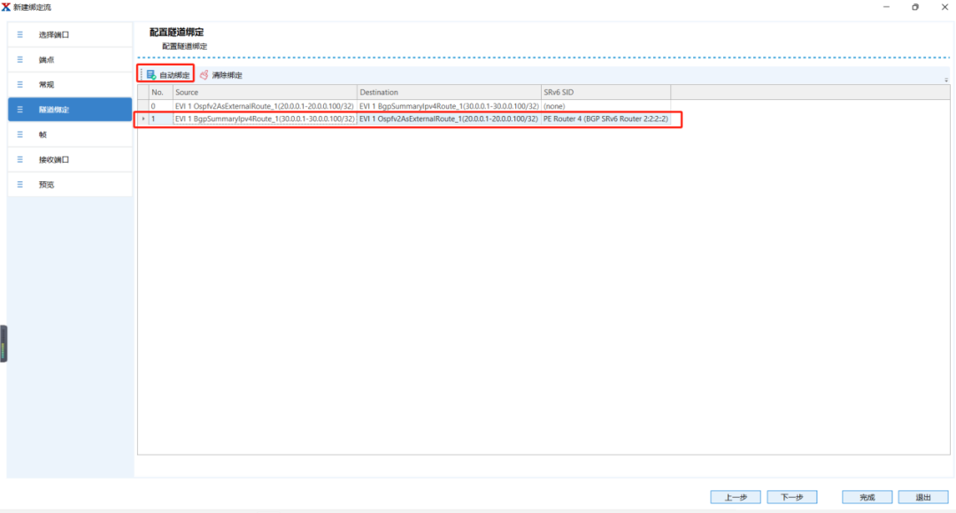 隧道绑定界面选择PE到CE侧的流量,点击“自动绑定”,绑定SRv6 SID业务标签,然后可以跳过剩余配置,点击“完成”,完成仪表配置;