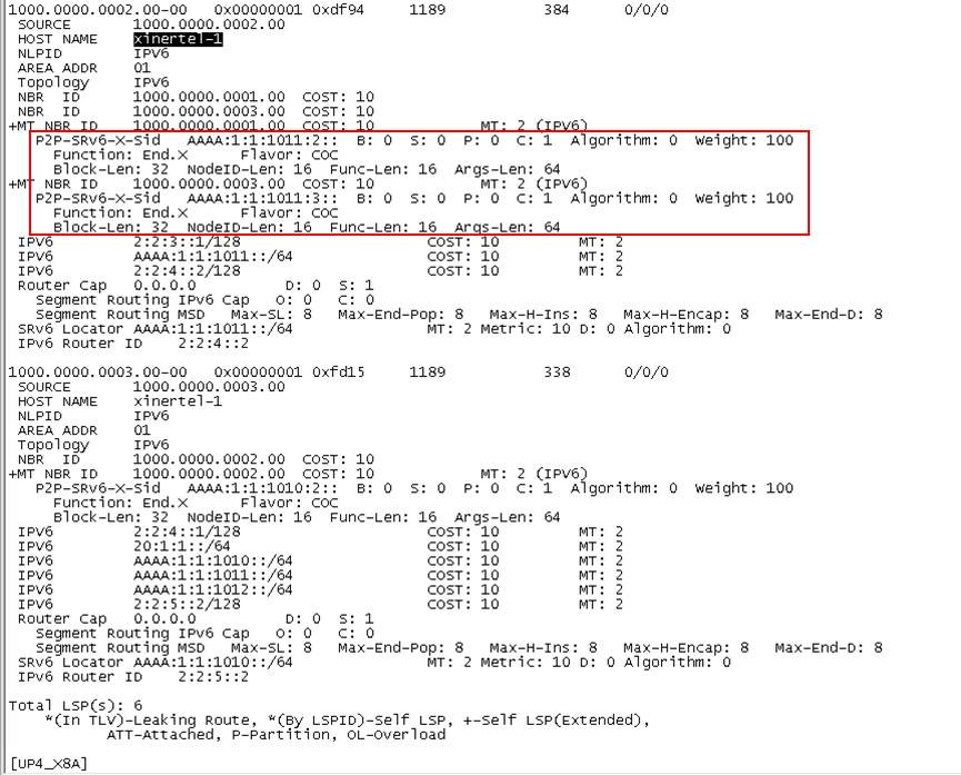 仪表模拟多跳的P节点,通过isis发布每个节点的邻居tlv和各自的ipv6路由tlv、SRv6 locator tlv等信息,并且邻居tlv和SRv6 locator tlv中携带相应的end with coc、end.x with coc,实现向dut通告G-SRv6能力,如下所示: