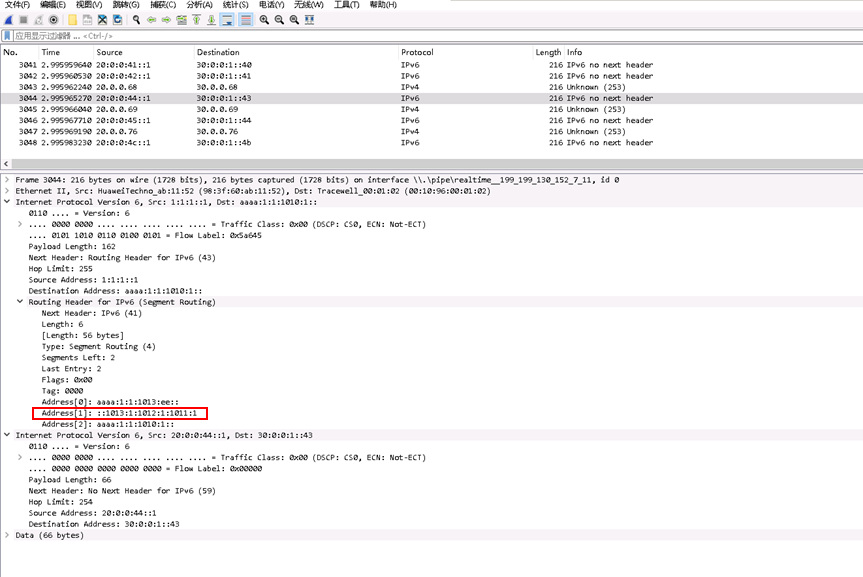CE侧抓包观察,仪表发送的PE侧流量经过dut后正常封装压缩的SRv6 SID,符合预期;