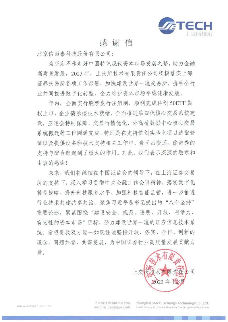 感谢信 | 信而泰携手上交所技术共谋数字化转型,助力金融行业发展