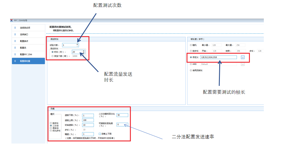 3、配置吞吐量测试参数,可以根据实际需要测试,建议测试帧长为64,128,256,512,1024,1280,1518等7个字节,测试次数可以选择3-5次,取多次测试的平均值;