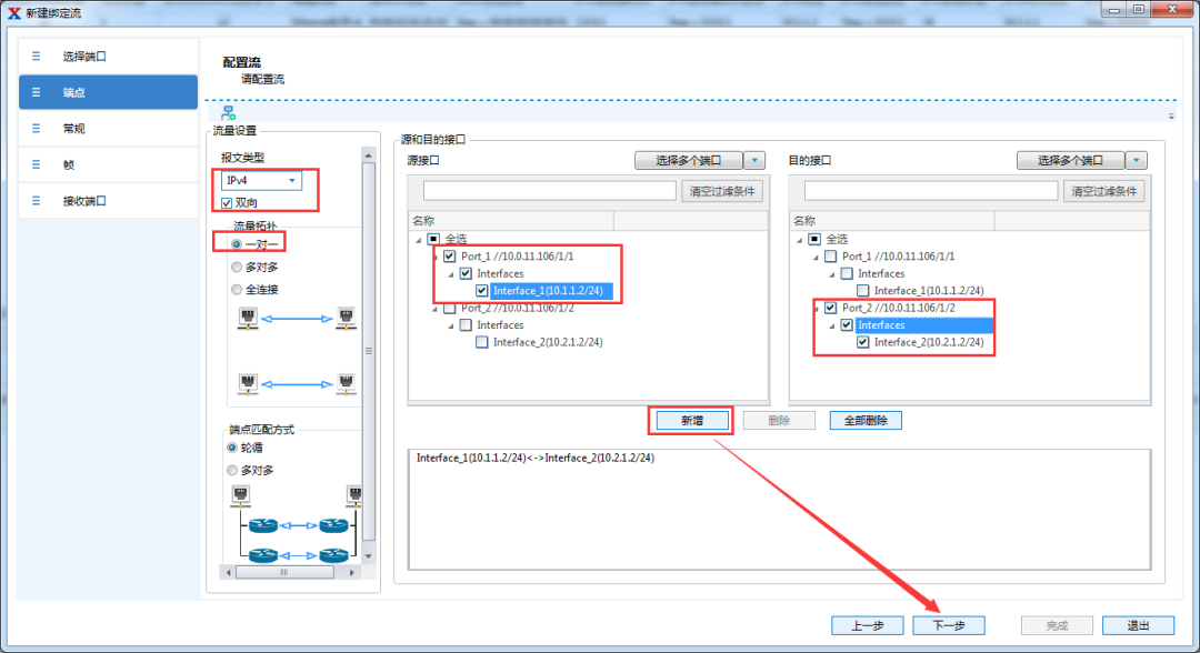 2、配置绑定流--选择源目接口,也就是对应的IP之间进行打流,在配置的时候可以选择是否添加UDP或者TCP包头,也可以配置对应的帧长,载荷参数等;