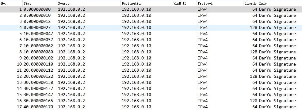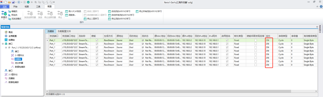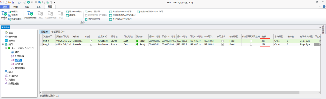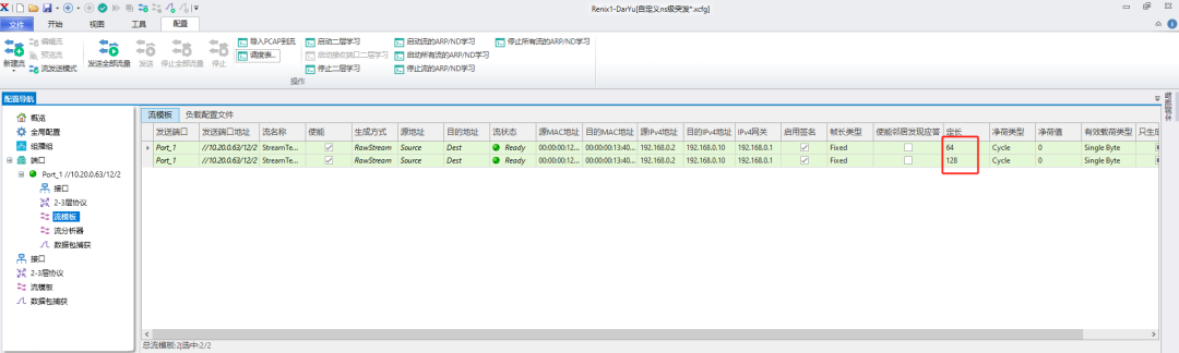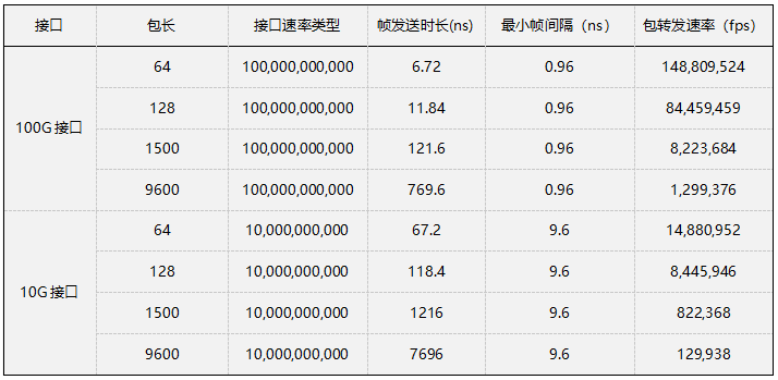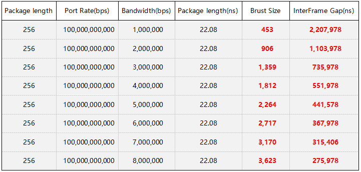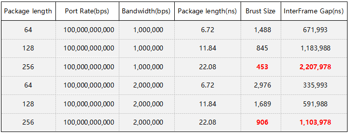 如下图所示,根据箭头指向逐个配置,纳秒级突发与包长、接口速率有关,如下表所示,包长与帧发送时长正相关。实现纳秒级突发,可根据需求选择包长。