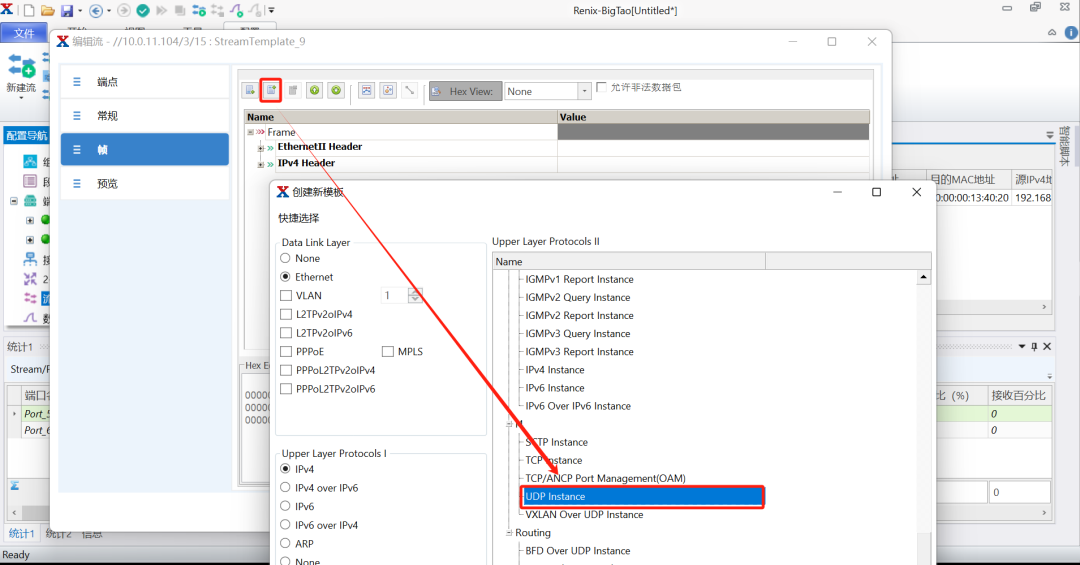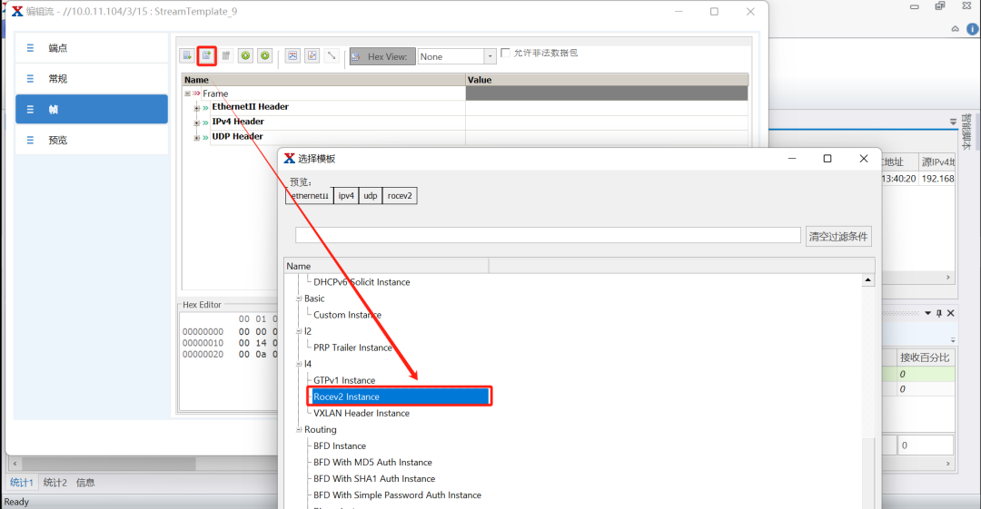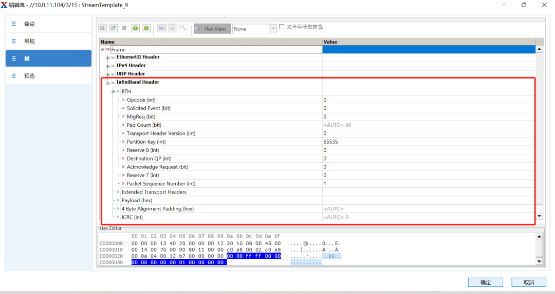 创建完成后可以在流模板帧界面可以看到创建的该条流量是基于UDP的infiniband流量,并且每个字段都支持自定义编辑。