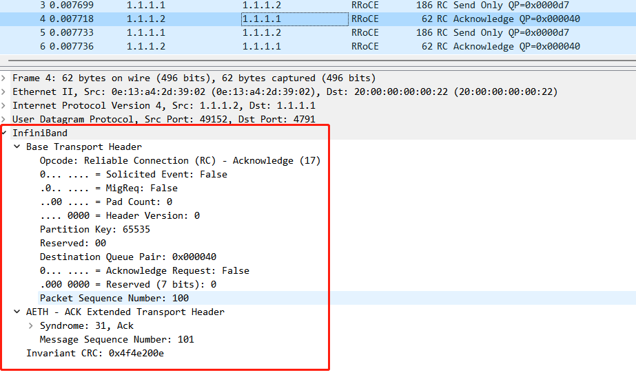 基础传输头部(BTH):包括Opcode、DestQP和PSN。Opcode表示报文操作类型;DestQP表示对端CA的目标QP(QueuePair,是IB协议中信息传输的重要机制);PSN(PacketSequenceNumber)占24-bits,表示报文序列号,可以用于报文顺序检查和报文重传。