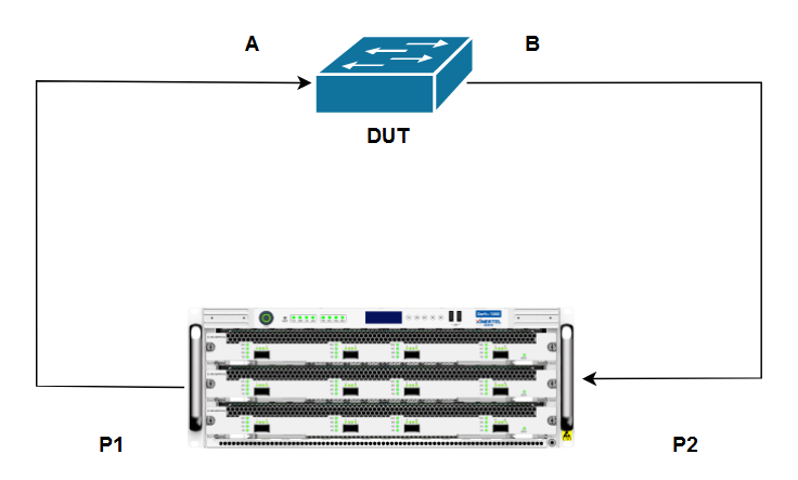 如图所示,测试仪P1与P2端口与DUT的A、B端口互联,通过在测试仪A端口构造Infiniband流量发送至A端口,应答消息由B端口发送至测试仪B端口,来模拟CA设备之间的消息交互场景。