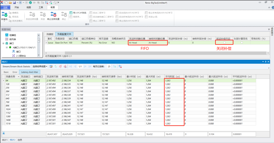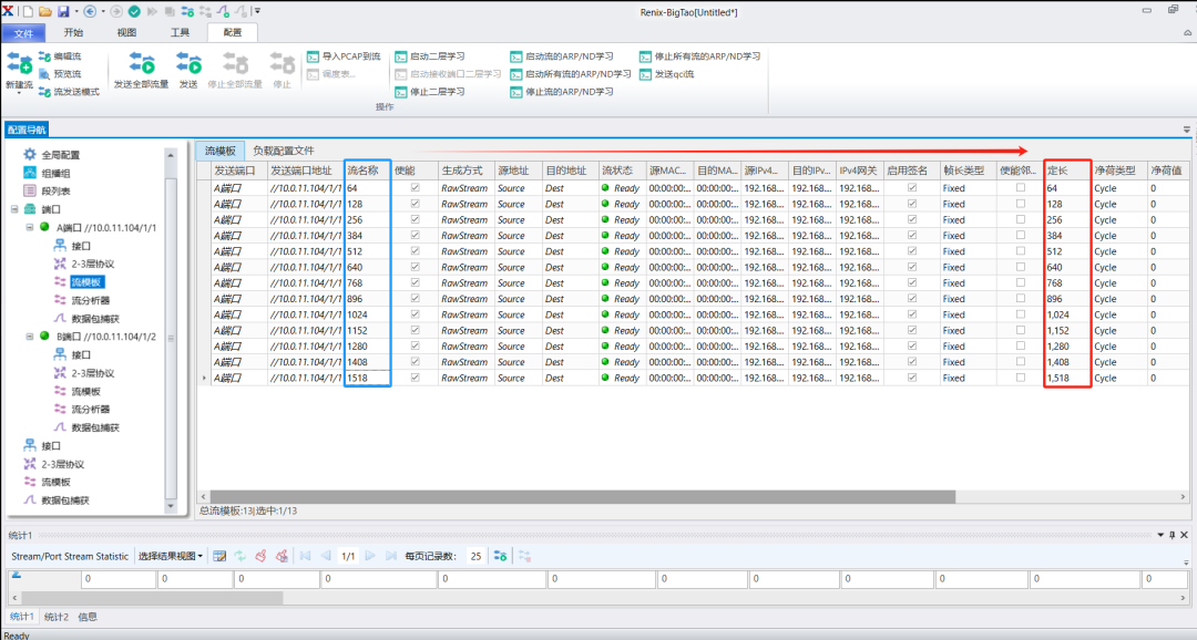 1)并且在A端口下创建不同的常规字节流(为了方便后续的统计,常规流包含了最常见的字节长度,同时尽量每条流之间间隔128byte),且修改流名称与定长相同以便后续时延的观察统计;