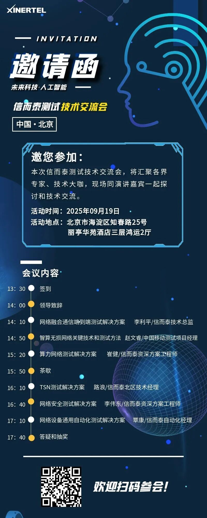 本次活动由信而泰主办,诚挚邀请您参加北京测试技术交流会。会议旨在为行业专家、技术工程师及合作伙伴搭建一个深度交流与前沿技术共享的高价值平台,共同探讨测试领域的最新发展与实践创新。