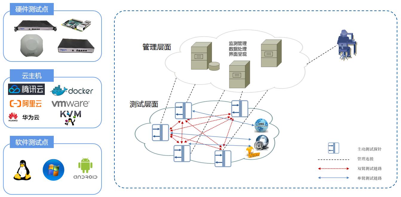 支持各数据中心之间网络线路验证(包括延迟、抖动、乱序、丢包率、网络可用带宽、服务质量验证)、应用协议拨测(云应用、企业数据中心)、 VM之间网络性能测试(同一数据中心、跨数据中心)等;